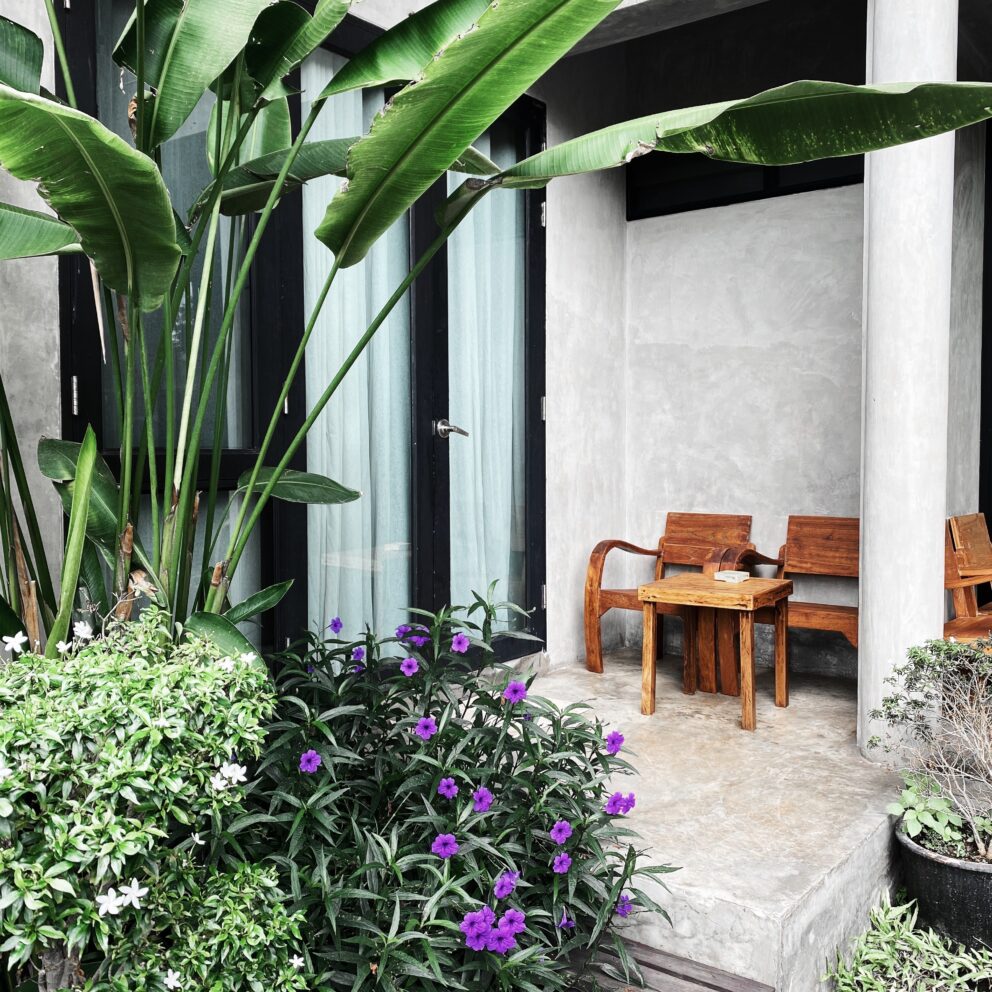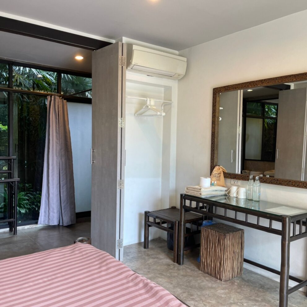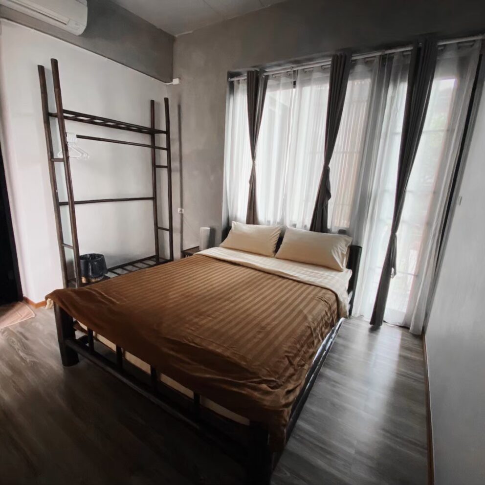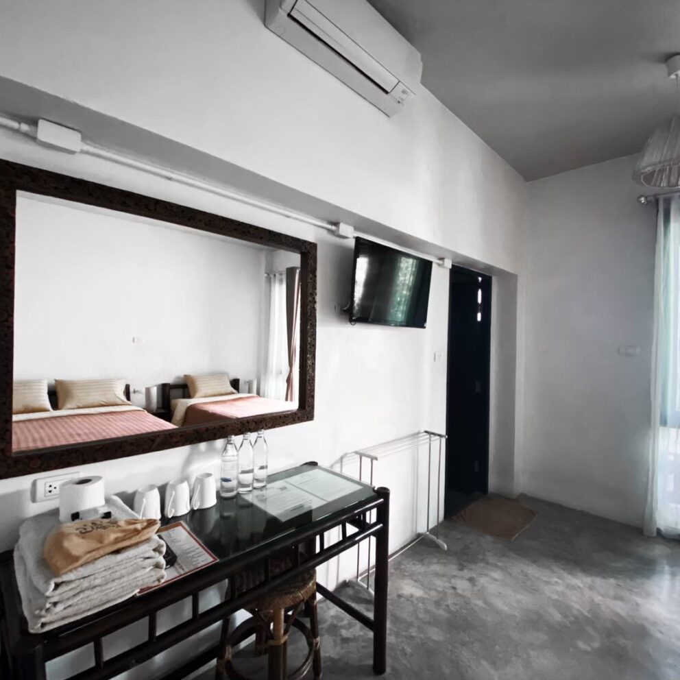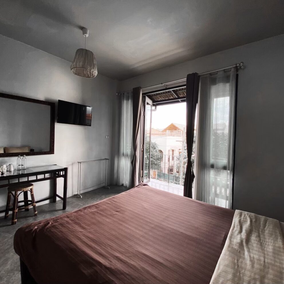 These rooms were designed with loft style and very bright & spacious but surrounded by greenery – they are double or queen beds. Room sizes is 20 sqm. excluding 6 sqm. terrace. The interior is made with loft cement walls and minimalist furniture. Makeup mirror and chair are also included nearby the television set.