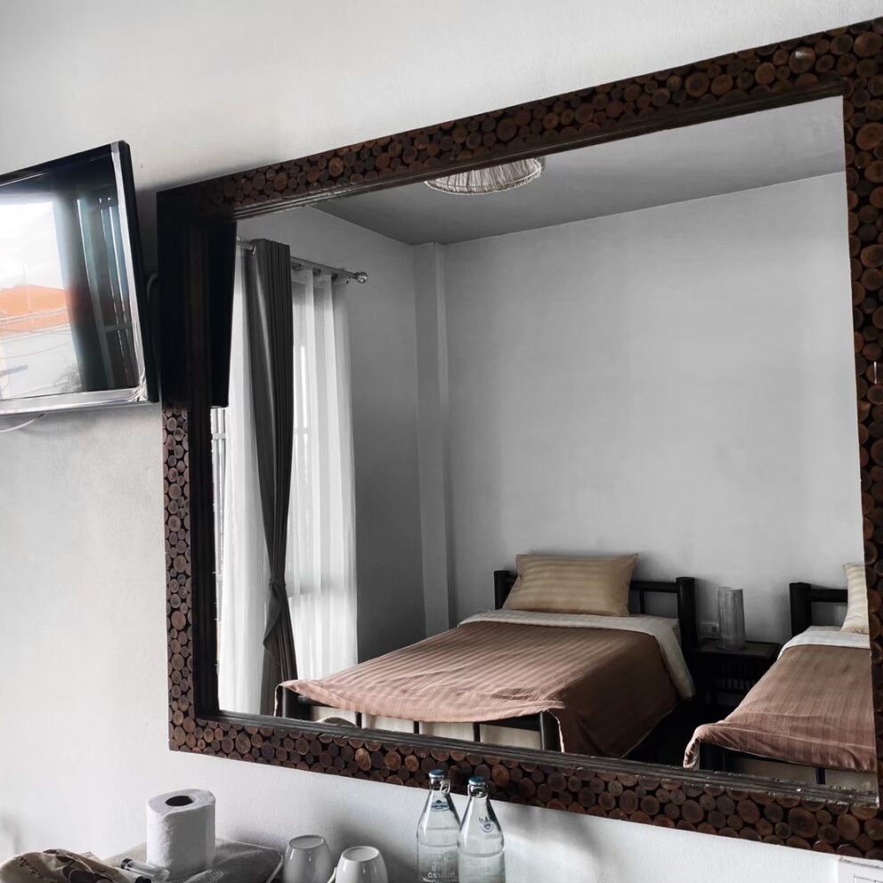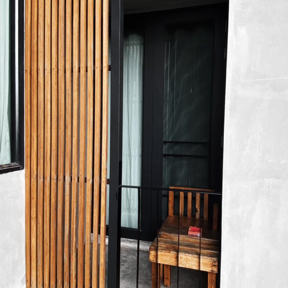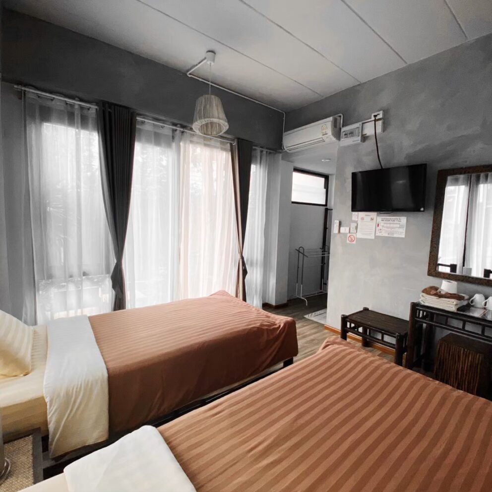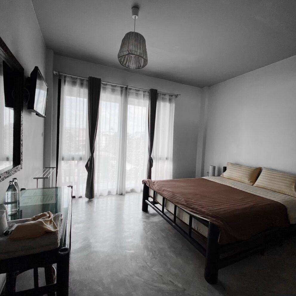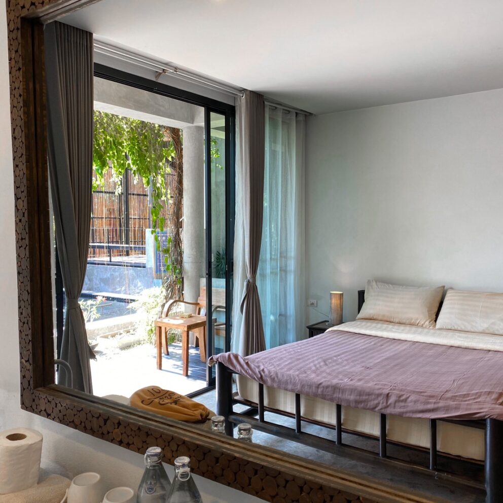 These rooms were designed with loft style and very bright & spacious but surrounded by greenery – they are double or queen beds. Room sizes is 20 sqm. excluding 6 sqm. terrace. The interior is made with loft cement walls and minimalist furniture. Makeup mirror and chair are also included nearby the television set.