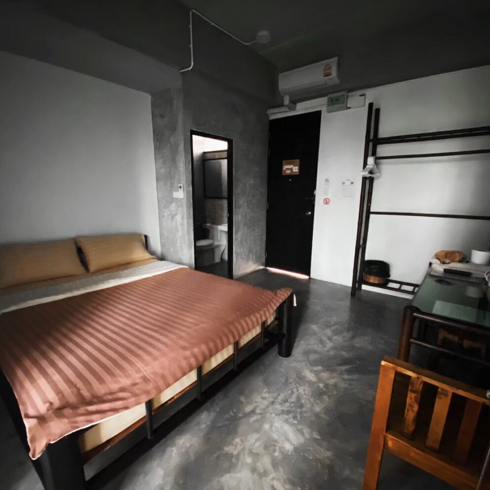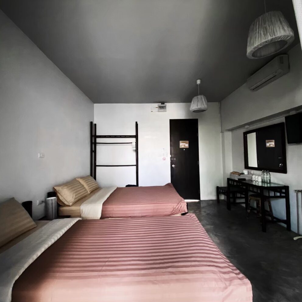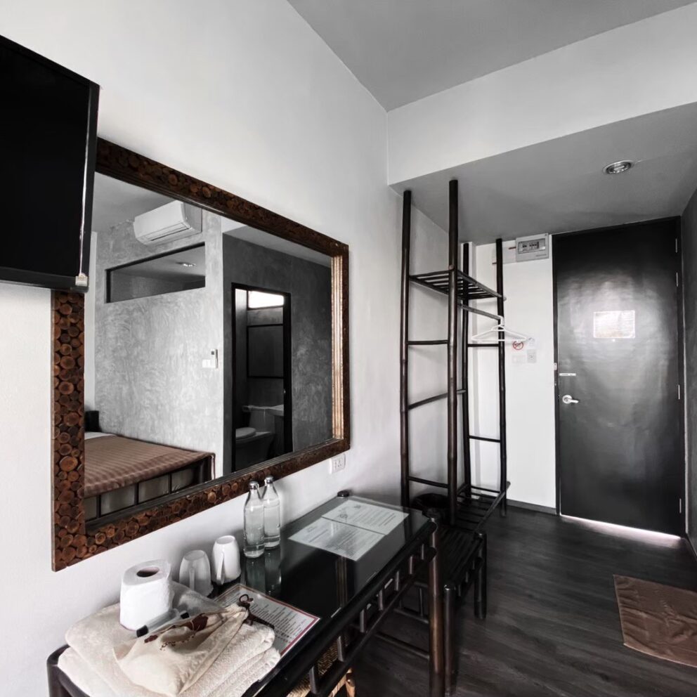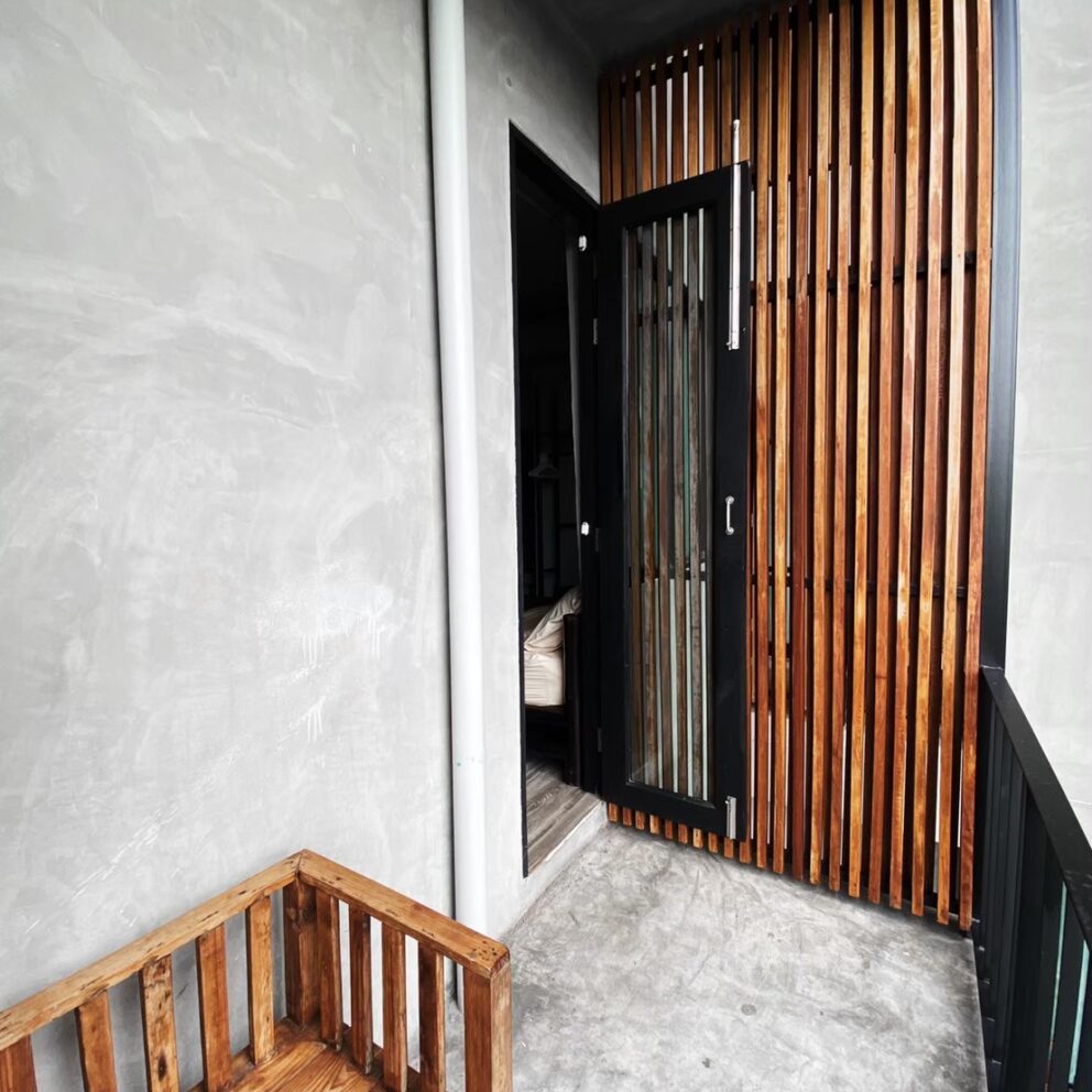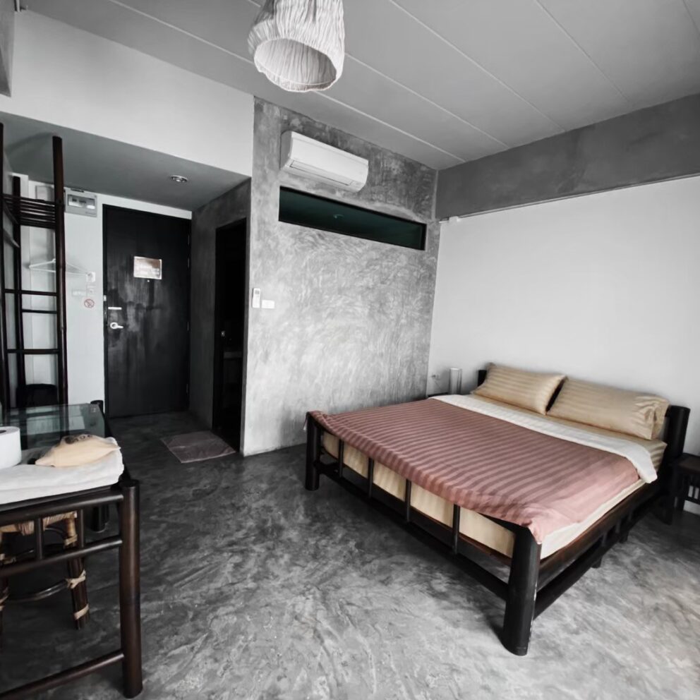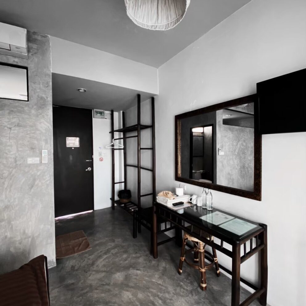 These rooms were designed with loft style and very bright; spacious – they are available with either double or queen beds. Room size is 16.5 sqm. excluding 1.5 sqm. balcony. The interior is made with stylish loft cement walls and minimalist furniture. Makeup mirror and chair are also included beside television set.