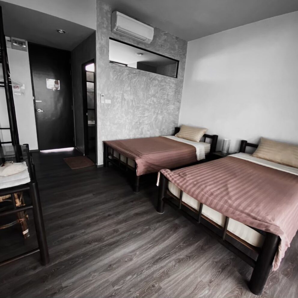 These rooms were designed with loft style and very bright & spacious – they are queen bed and single bed. Room size is 21.50 sqm. excluding 4.5 sqm. balcony. The ceiling is higher than normal standard room type. The interior is made with loft cement wall and minimalist furniture. Makeup mirror and chair are also included beside television set.