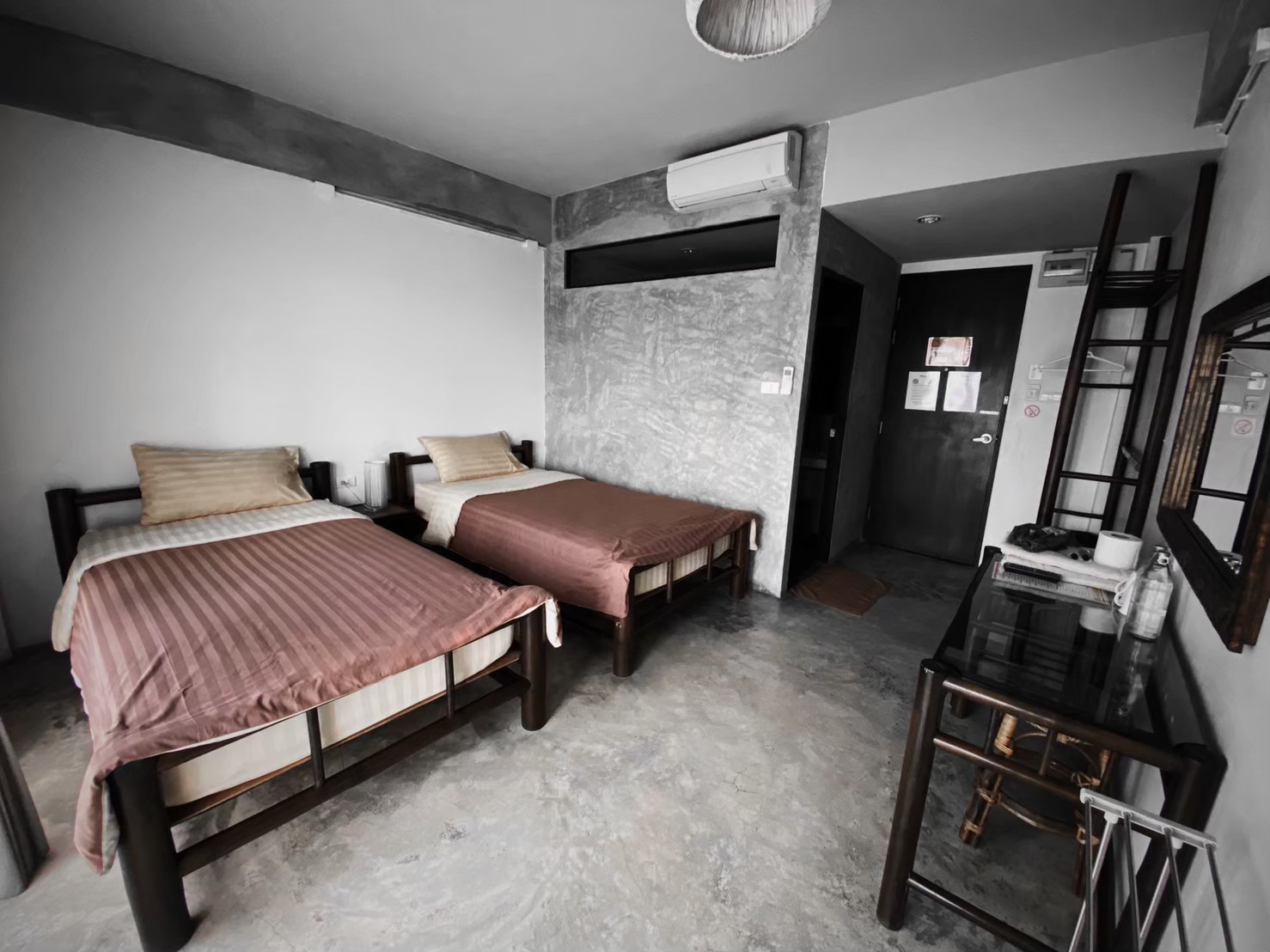 They are available with either twin or 2 single beds. Room size is 20 sqm. excluding 4.5 sqm. balcony. The interior is made with stylish loft cement walls and minimalist furniture. Makeup mirror and chair are also included beside television set.